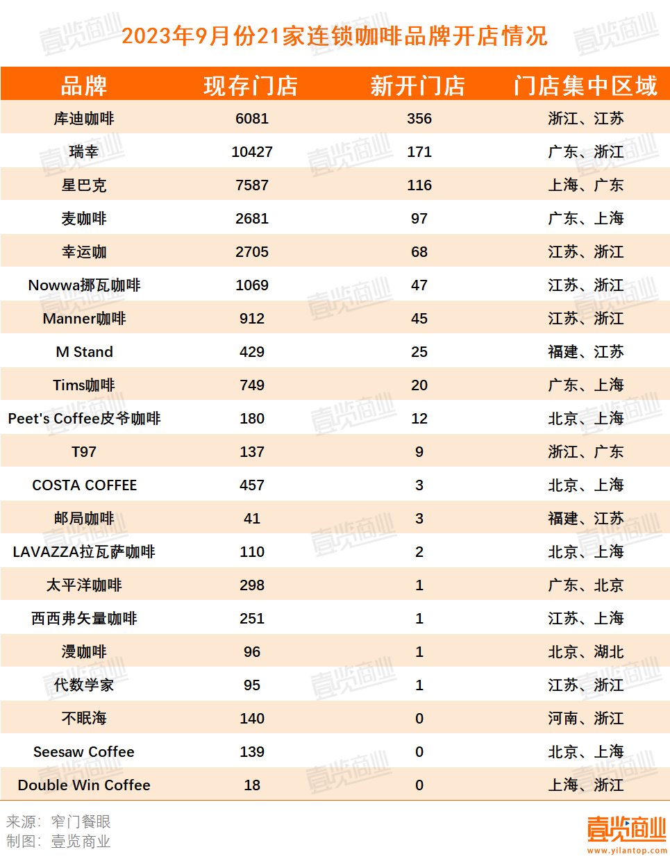 從整體開店數量看:20239月份,國內21家連鎖咖啡品牌一共新開門店978家。現存門店一共38126家。