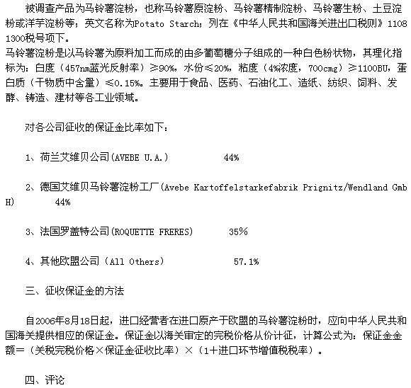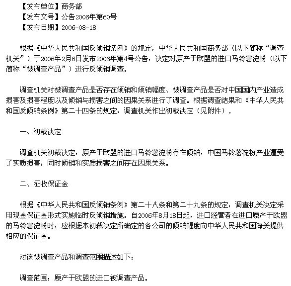 商務部公告2006年第60號 對原產于歐盟的進口馬鈴薯淀粉反反傾銷案的初裁公告
