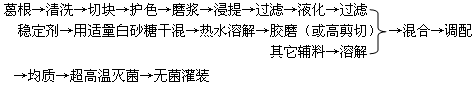 (1)清洗:在流水池中用刷子清洗葛根表皮上的泥土,并切去干縮,病蟲污染及霉爛變質部分。 (2)磨漿:將葛切碎塊后,放入異Vc―Na護色液中。護色液重為葛重的1.8倍。打漿機打漿,靜置。調節護色液的pH值為6.0、靜置時間80分鐘,靜置溫度