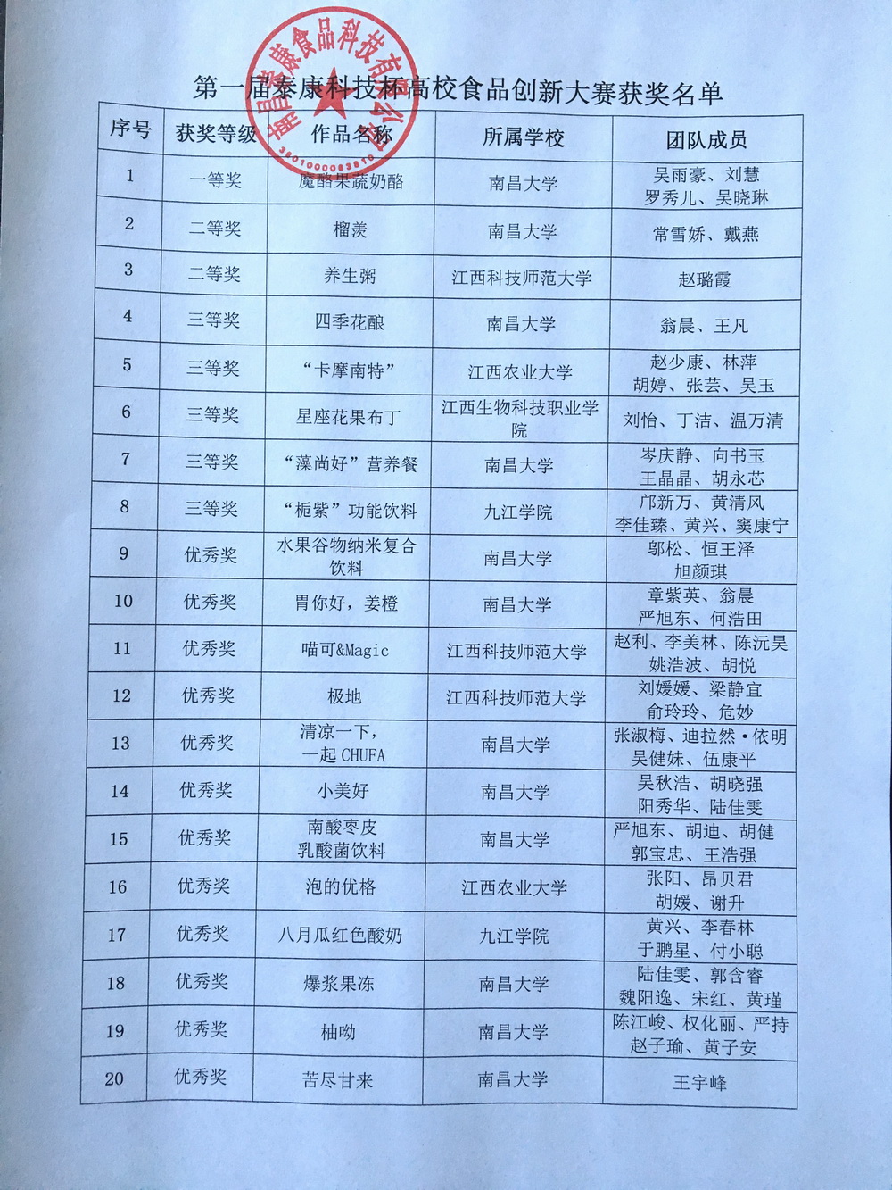 第一屆“泰康科技杯”高校食品創新大賽自2017年11月起在南昌大學,江西農業大學等多所高校學子的熱情參與下,經過近三個月的時間,終于落下帷幕,現將大賽獲獎名單公布: